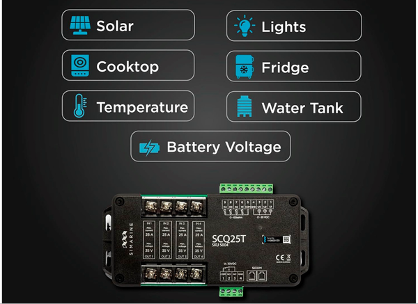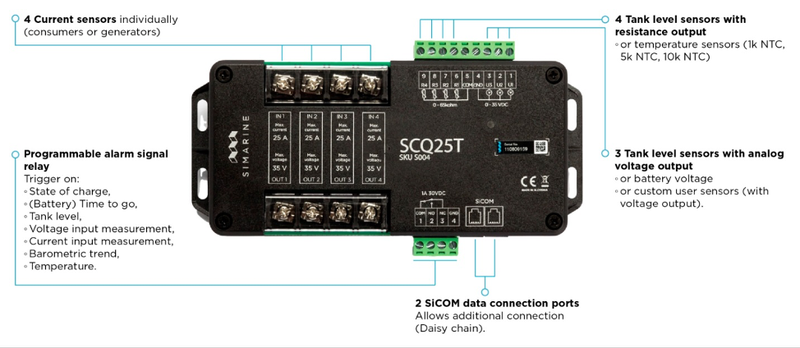 Quadro SCQ25T version not only measures voltage and current, but also monitors liquid levels in tanks and temperature. It combines the functionality of two Simarine level and voltage modules – SCQ25 and ST107.