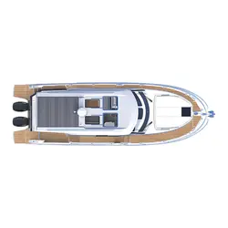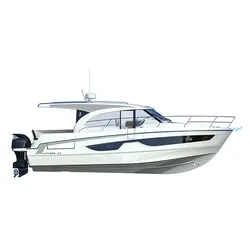 À l'intérieur de ce bateau familial, il y a deux cabines sur toute la largeur de la coque avec cinq couchettes en plus de deux dans le salon. La salle de bains est divisée en une douche et une toilette - une rareté pour 11 mètres. Vous pouvez vous prélasser au soleil en laissant pendre vos jambes depuis la section repliable du bastingage, sur le banc arrière ou sur le bain de soleil du pont avant. La version avec flybridge (Fly) sera un excellent choix pour les mers chaudes. La coque en fibre de verre de type "V profond" a reçu des conduits d'air Air Step de marque pour une meilleure tenue à la mer.