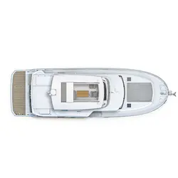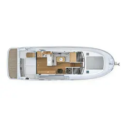 Dans le cockpit, l'espace salon est combiné avec la salle à manger : un grand canapé et une table pliante avec des chaises pliantes. L'échelle menant au flybridge avec des marches en teck peut être déplacée le long des rails et fixée. Des portes doubles sur le tableau arrière du côté bâbord mènent à la plateforme arrière, qui peut être utilisée comme plateforme de baignade ou pour transporter un canot pesant 350 kg.
