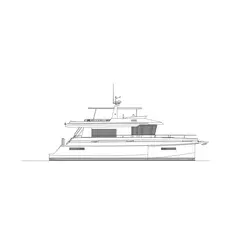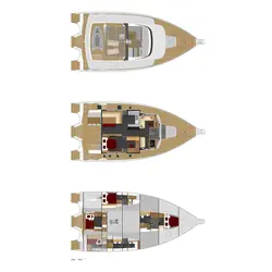 La disposition standard du trimaran à moteur Leen 56 comprend 3 cabines doubles avec salles de douche : une cabine propriétaire à deux niveaux, une cabine d'invités située à l'avant du bateau dans la coque centrale avec une salle de douche séparée, et une autre cabine d'invités située dans la coque bâbord avec une salle de douche séparée. Il y a aussi 2 lavabos et des toilettes séparées.