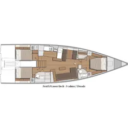 Pour maximiser l'excitation au gouvernail, une attention particulière a été portée à la distribution optimale du poids et à l'équilibre sous voile. Par exemple, le centre de flottabilité est aligné avec le centre de poussée. La proue droite améliore l'espace, tandis que la largeur maximale à l'arrière, un tirant d'eau de 2,5 ou 3 mètres (avec bulbe en plomb) et deux safrans assurent un contrôle parfait sur la coque très réactive. La capacité du First 53 à parcourir rapidement des milles lui confère un avantage compétitif.
