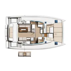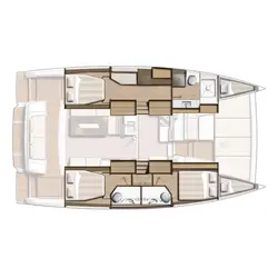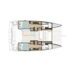 Ce catamaran est étonnamment spacieux pour sa taille, offrant au propriétaire ou à l'entreprise de location 3 ou 4 cabines luxueuses avec beaucoup de rangement, des canapés, des lits king-size et même des étagères.