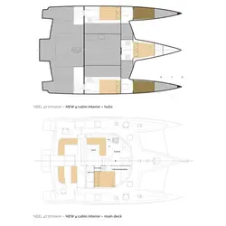 Au choix du propriétaire, toutes les cabines d'invités peuvent être améliorées en classe de luxe. Et en option, en face des cabines de luxe, deux cabines simples peuvent être situées avec un accès par des trappes de pont. Cela augmente la capacité du trimaran de 3 à 5 cabines, de 6 à 10 couchettes, et c'est une excellente nouvelle pour ceux qui veulent acheter un Neel 47 à des fins de location.