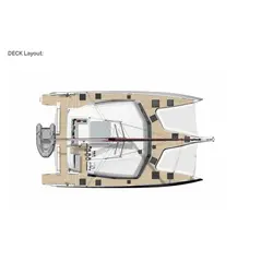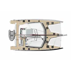 La coque centrale est pivotante, ce qui facilite la manœuvre. La grande hydrodynamique des flotteurs assure la stabilité et élimine le tangage. Le poste de barre dispose de trois sièges et permet une coordination facile entre l'équipage et le skipper grâce à un accès direct depuis le pont ou le cockpit.