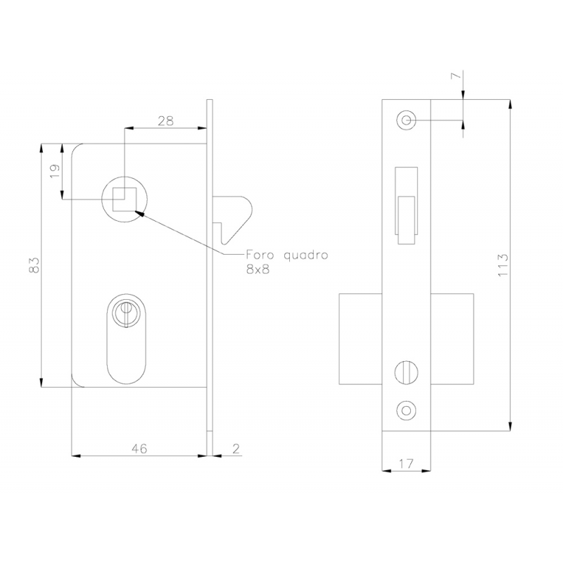 The casing dimensions are 83mm x 17mm, with an 8mm square keyhole.