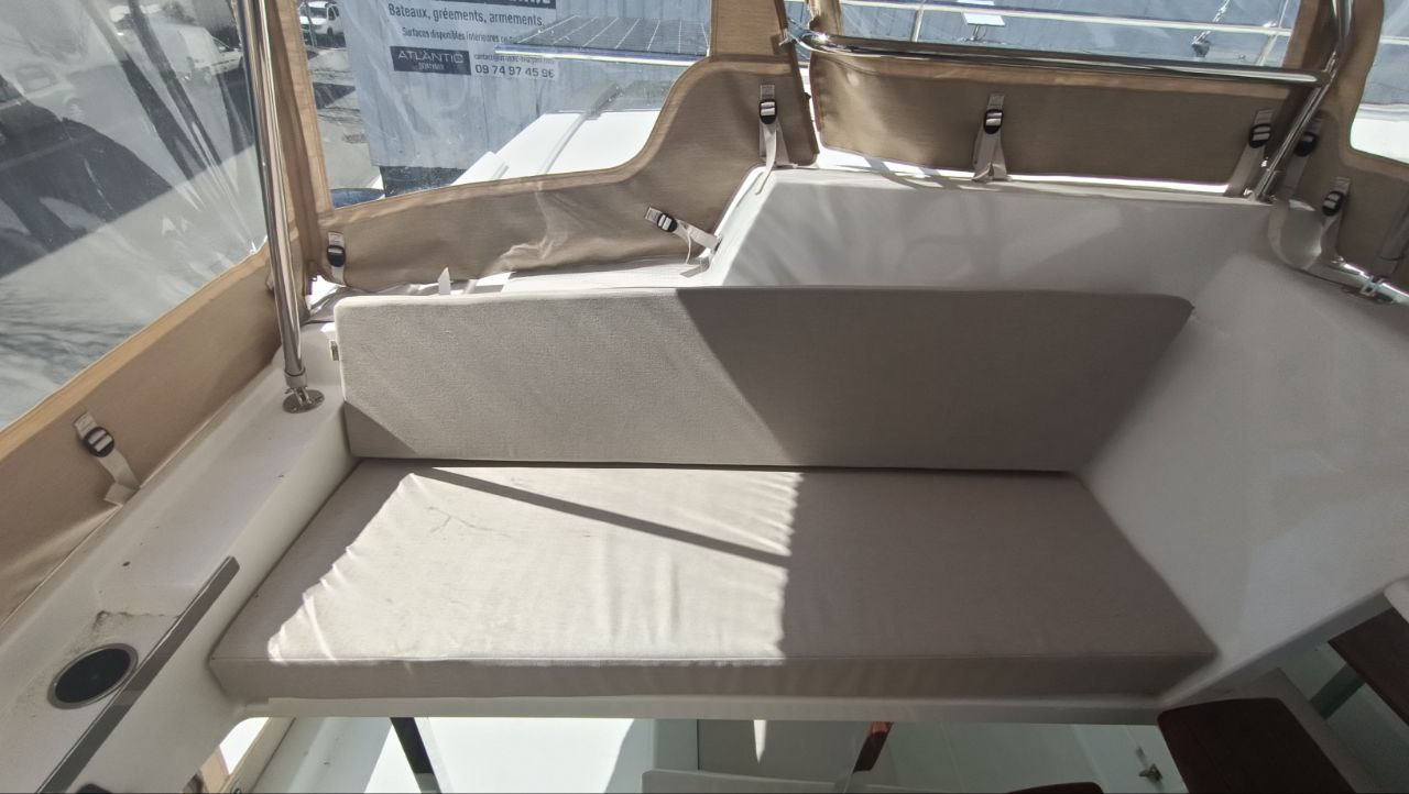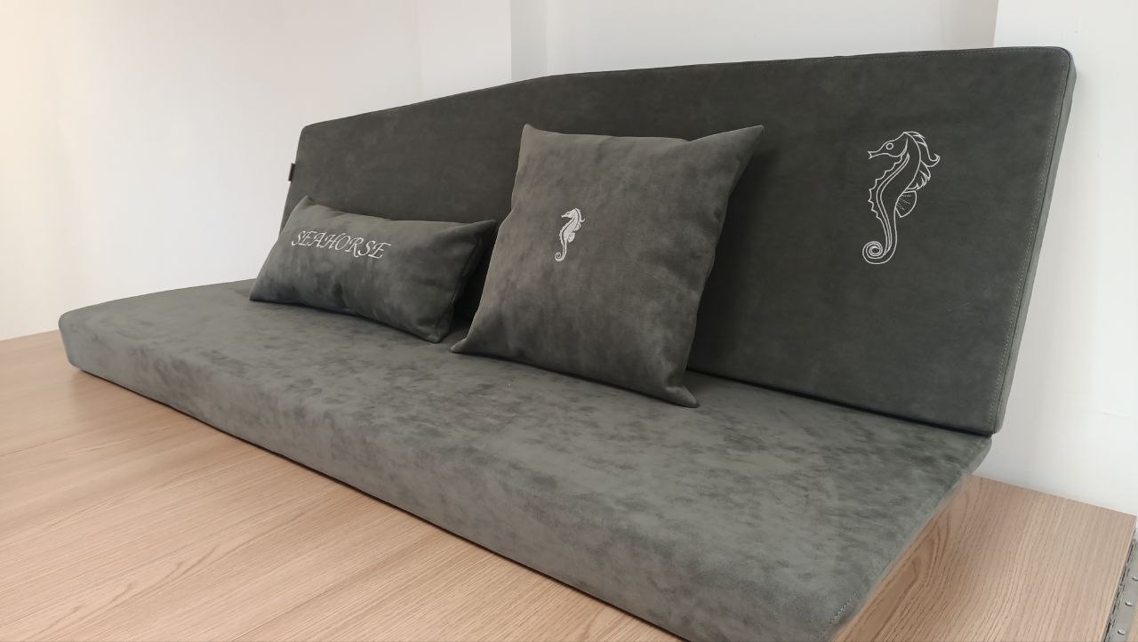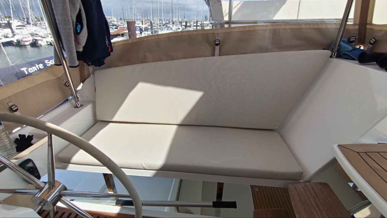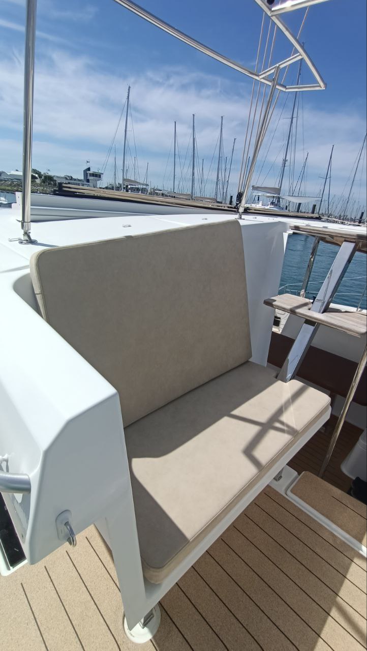 Siège et dossier coussins confectionnés en tissu Sunbrella outdoor, mousse celulles ouvertes correspondent aux dimentions des bateaux Aura 51, Isla 40, Tanna 47, Astrea 42